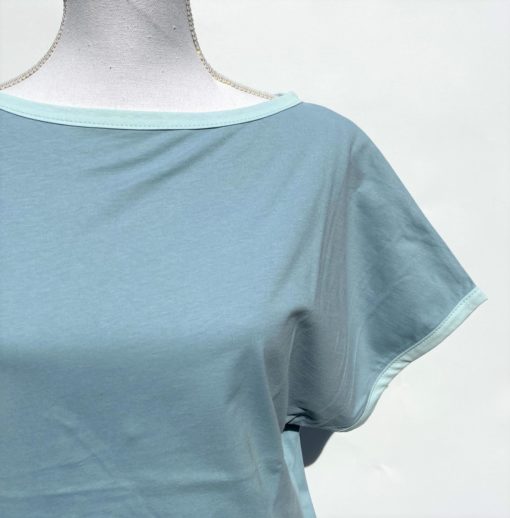 Superzacht jersey shirt met vleermuis mouwen in de kleur ‘ice blue’ met contrasterende bies aan de hals en mouw, label aan de rechter onderkant met Fairly Dressy.