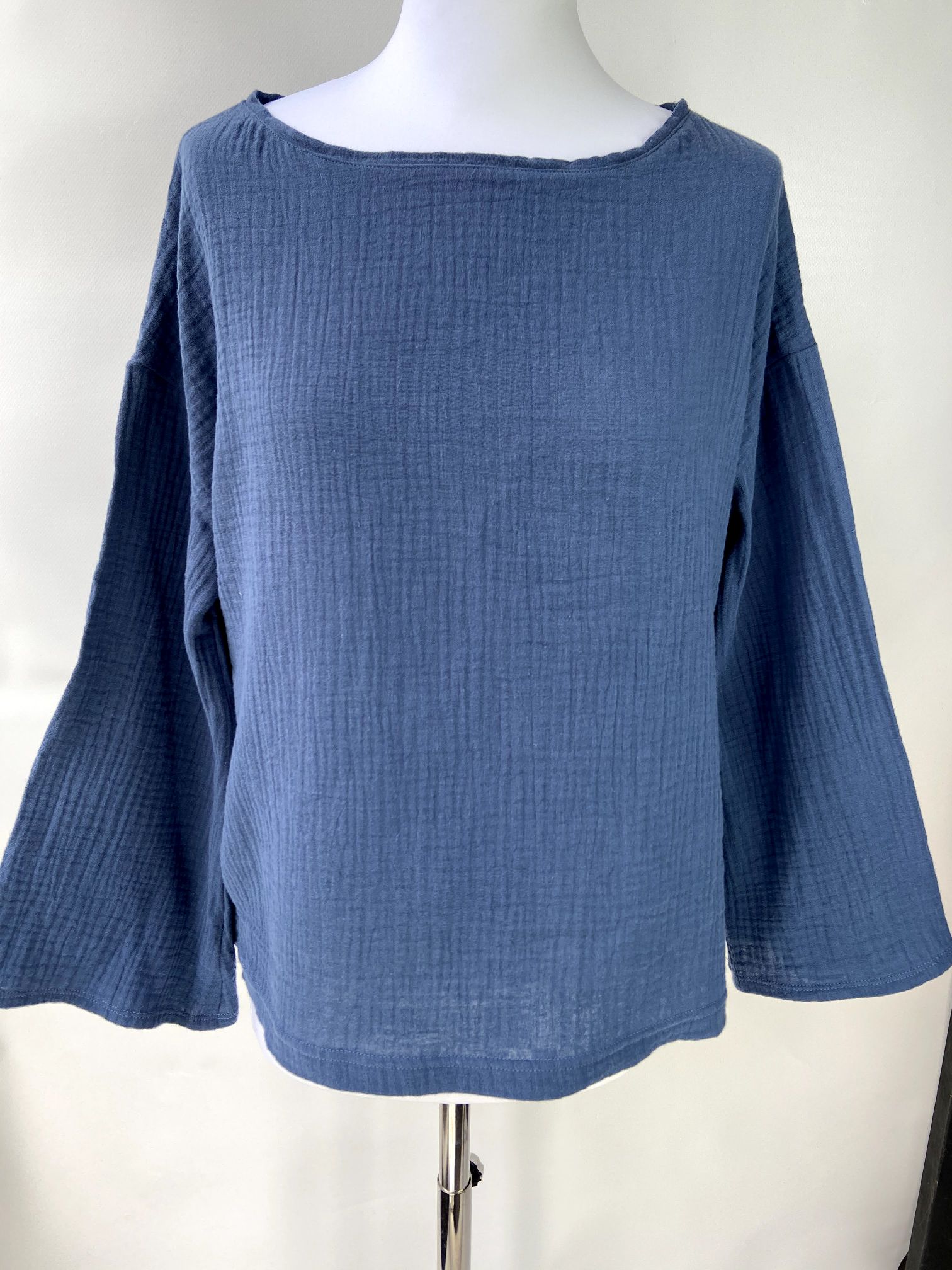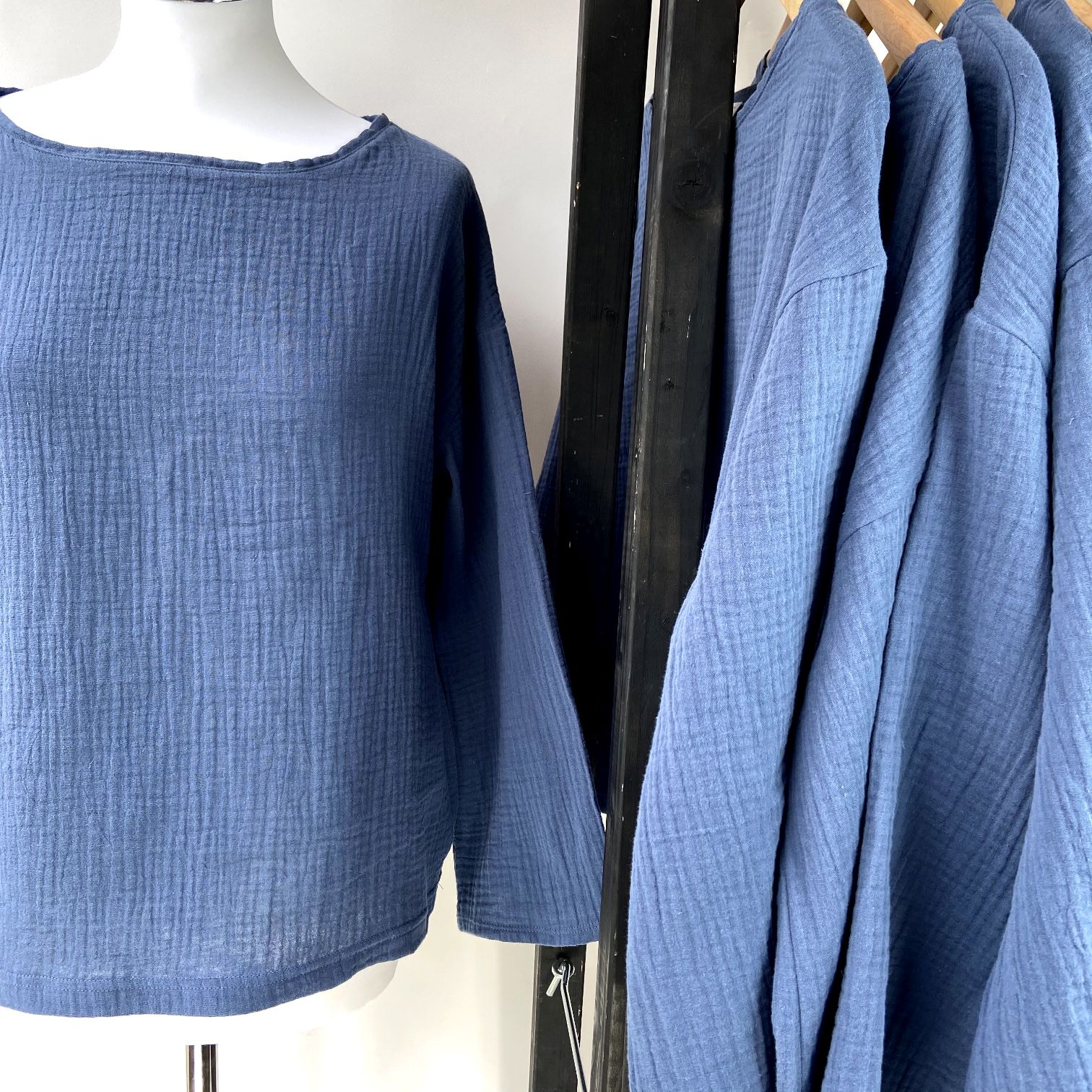 De stof is double gauze, dubbel geweven katoenen stof die zeer luchtig draagt. De kleur is jeansblauw.
